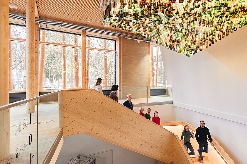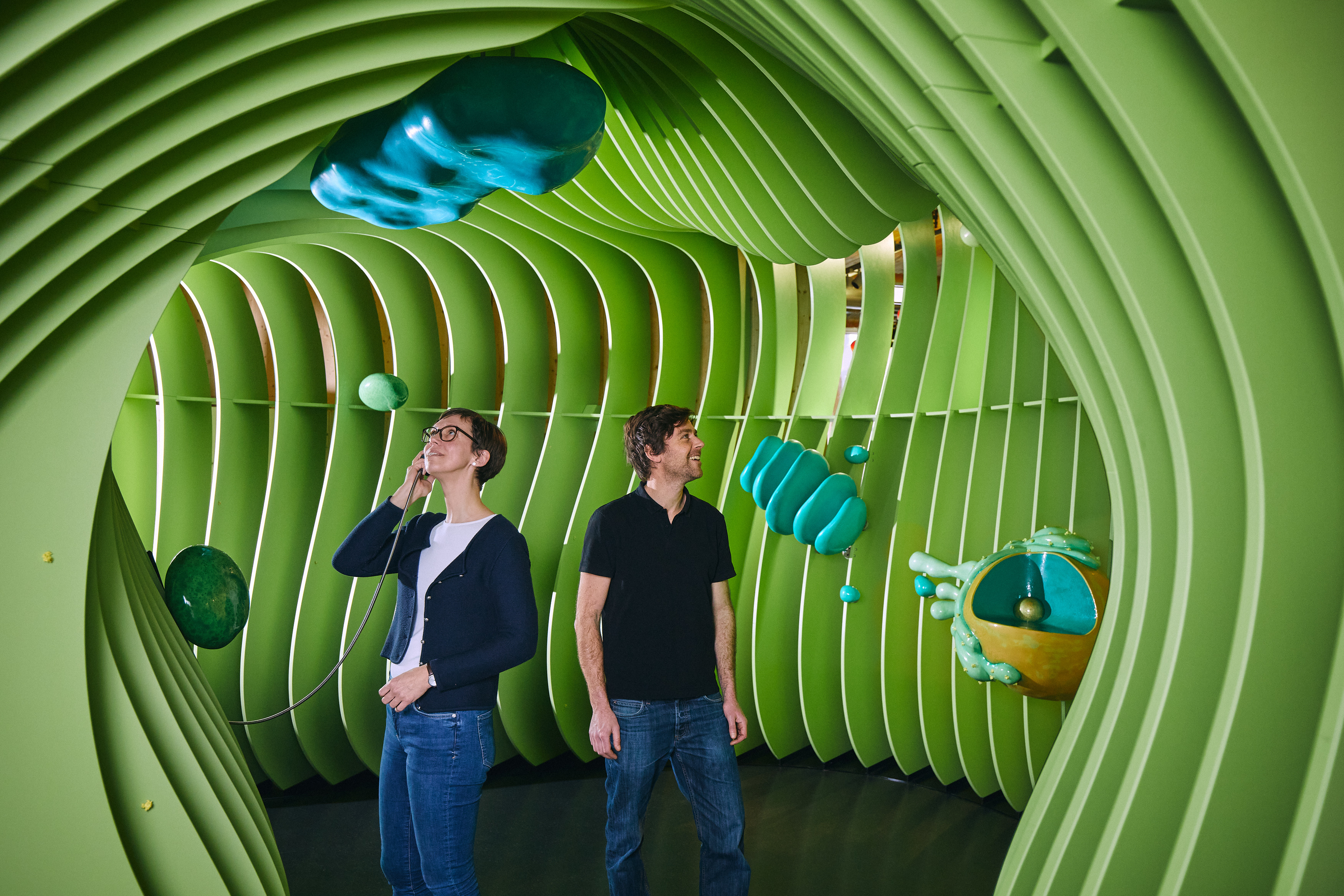 On three floors and 1250 m², the exhibition covers diverse topics such as climate change, plants, nutrition, renewable resources and energies. A hands-on approach is expressly encouraged here. There are interactive exhibits and games, a walk-in plant cell, and – a highlight – a wooden slide in the middle of the building. The exhibition is designed for adults and children aged 12 and older. A number of dedicated exhibits, marked with a small diamond, cater specifically to the interests of children between the ages of 6 and 12. All exhibition texts are available in English and German.