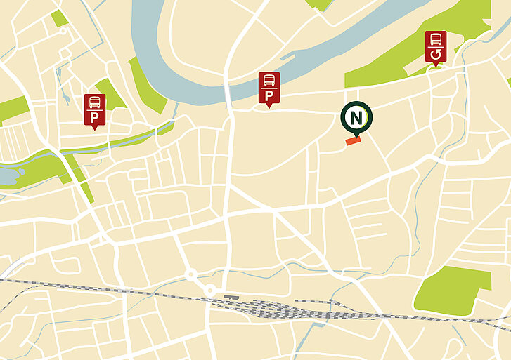 Please use the bus stop Peterswöhrd only for disembarking (5–10 minute walk to the NAWAREUM) and park your coach at the free parking lot Am Hagen. Alternatively, you may use one of the two parking spots for busses at the Donaugasse parking lot.